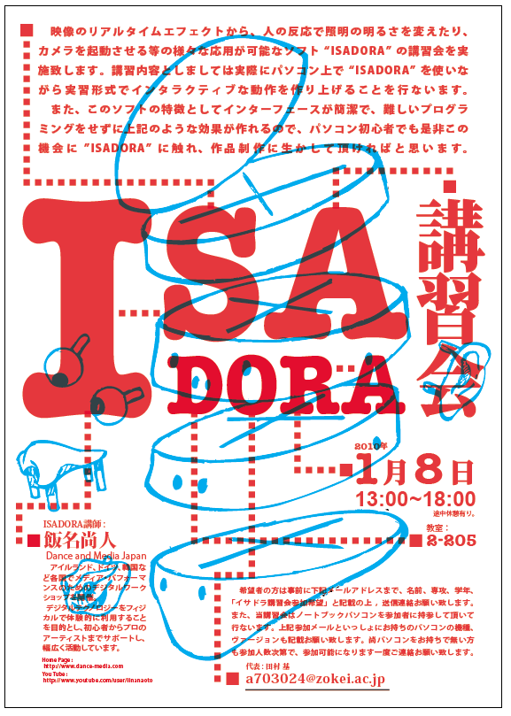 学校の緒用で"ISADORA"というソフトの詳細を調べなくてはいけなく、Googleで検索していた。頼まれた関係上、映像の編集ソフトらへんの筈なんですが、なかなか出てこず、その代わり超ナイスなサイトを発見しました。お洒落な老若男女の諸君は要checkです。どうぞ。。>>>Isadora (PornみたいですがPornサイトではありません)